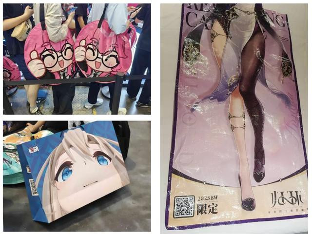 不过提及3号馆,我觉得最有趣的,是这个馆的产品们都默契地在周边袋子的设计上卷了起来:《异环》的圆形袋子上,是竖着大拇指的Q版猫娘娜娜莉;《归环》做了一个超级长的袋子,上面印着角色的大长腿;《少前2:追放》则把角色「索米」的大脸直接印在袋子上,角度看起来特别奇怪、但确实憨得可爱。