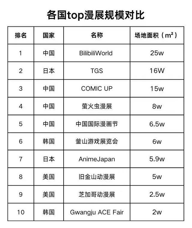 在举办的这几天里,网上盛传着一张表格,上面写明了全球各大动漫游戏展会的面积规模。而一举动用上海国展中心全部展馆的BW,以25万平米的面积,远远超过了第二名16万平米的日本TGS。
